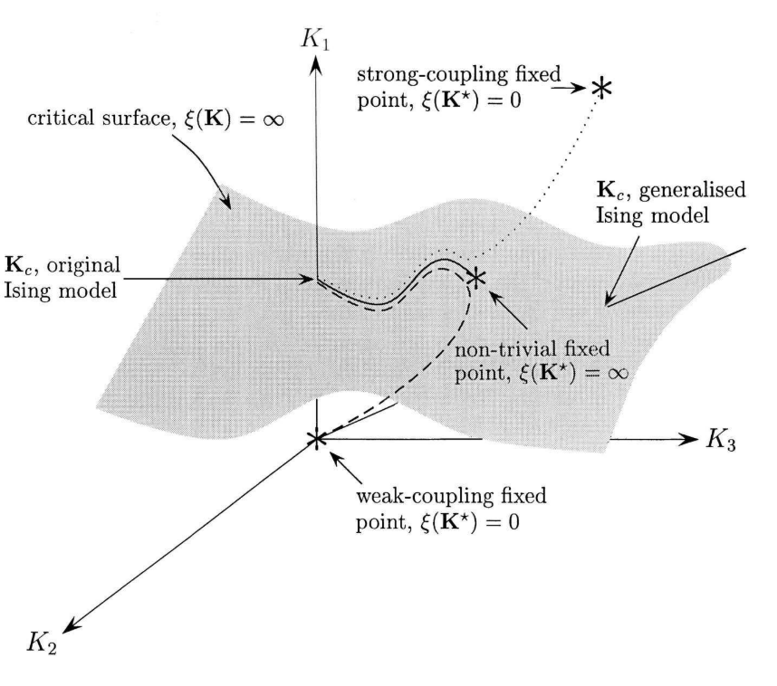 而我们通常讨论的 Ising model 除了K1以外其他系数都为0,所以对原始系统的重整化过程更加精确的描述应该是如图3所示。图3画出了耦合系数的三个维度,每次重整化操作耦合系数在这个空间中变化。