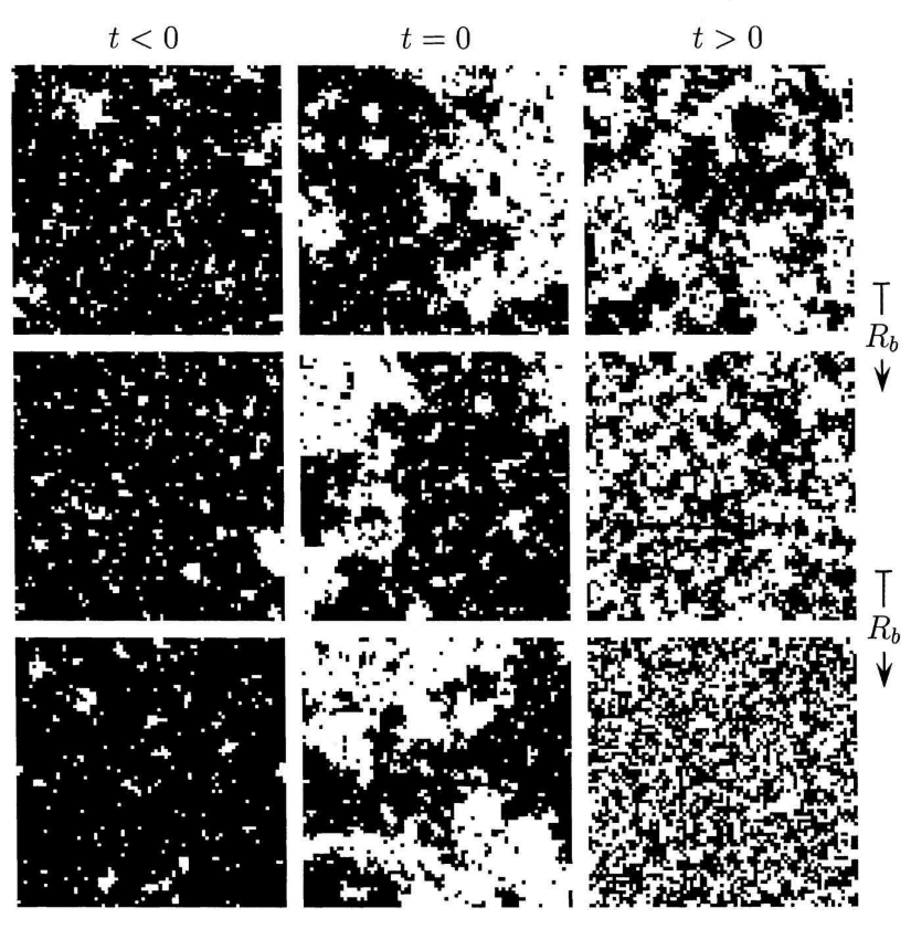 图1. Ising 模型2维空间的实空间重整化,外场为0。每一列代表的是不同的约化温度。每一行代表的分别是原始系统,1次重整化,2次重整化后的系统。