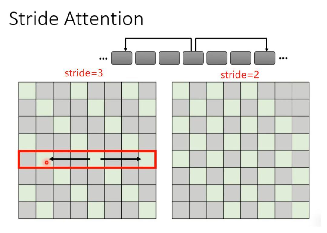 如果觉得上述这种 local attention 不好,也可以换一种思路,就是在翻译当前 token 的时候,给它空一定间隔(stride)的左右邻居,从而捕获当前与过去和未来的关系。当然stride的数值可以自己确定。
