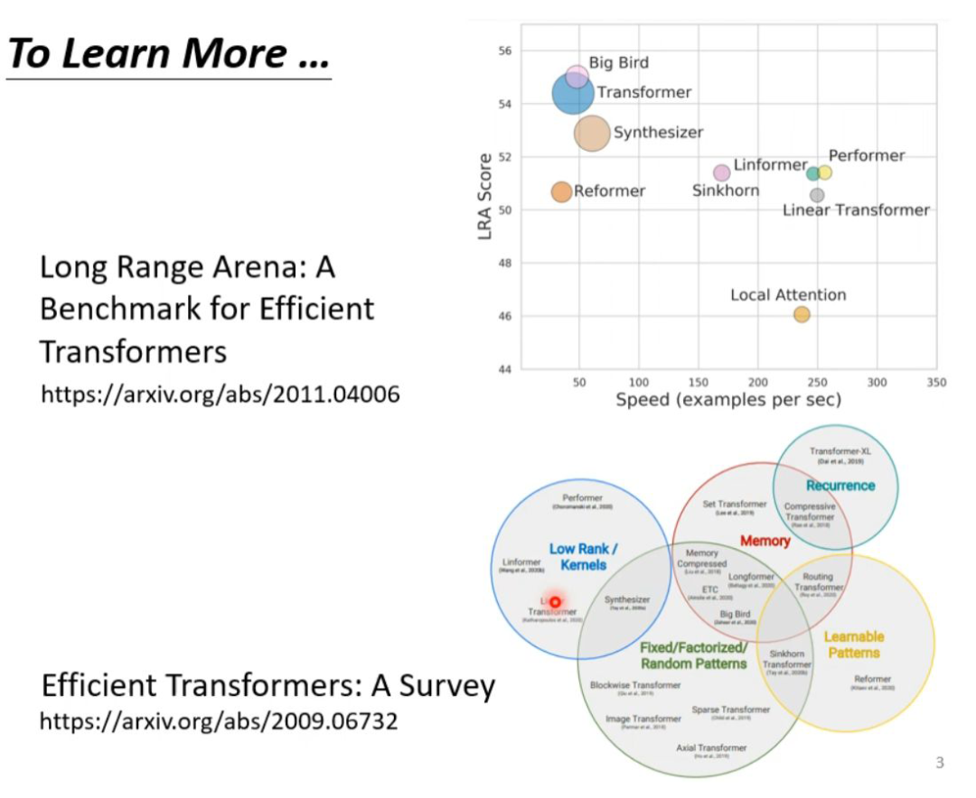 最后这页图为今天所有讲述的方法的总结。下图中,纵轴的 LRA score 数值越大,网络表现越好;横轴表示每秒可以处理多少 sequence,越往右速度越快;圈圈越大,代表用到的 memory 越多(计算量越大)。