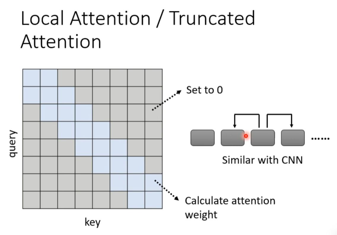 举个例子,比如我们在做文本翻译的时候,有时候在翻译当前的 token 时不需要给出整个 sequence,其实只需要知道这个 token 两边的邻居,就可以翻译的很准,也就是做局部的 attention(local attention)。这样可以大大提升运算效率,但是缺点就是只关注周围局部的值,这样做法其实跟 CNN 就没有太大的区别了。