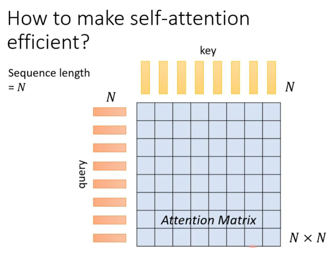 对于 transformer 来说,self-attention 只是大的网络架构中的一个 module。由上述分析我们知道,对于 self-attention 的运算量是跟 N 的平方成正比的。当 N 很小的时候,单纯增加 self-attention 的运算效率可能并不会对整个网络的计算效率有太大的影响。因此,提高 self-attention 的计算效率从而大幅度提高整个网络的效率的前提是 N 特别大的时候,比如做图像识别(影像辨识、image processing)。