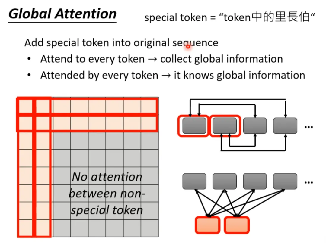 还有一种 global attention 的方式,就是选择 sequence 中的某些 token 作为 special token(比如标点符号),或者在原始的 sequence 中增加 special token。让 special token 与序列产生全局的关系,但是其他不是 special token 的 token 之间没有 attention。以在原始 sequence 前面增加两个 special token 为例: