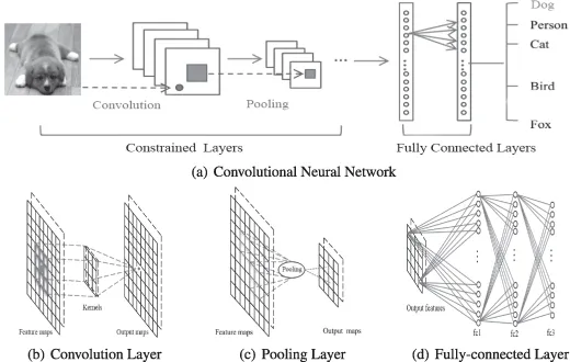 卷积神经网络是一种特殊的深度网络,它考虑了数据的局部拓扑结构(Li, Xia, Du, Lin, & Samat, 2017;Sze,Chen,Yang和Emer,2017)。卷积神经网络包括全连接网络和包含卷积层和池化层的约束网络。约束网络使用卷积和池化运算来实现局部感受野和参数约简。与 DBN 和 SAE 一样,卷积神经网络也通过随机梯度下降算法进行训练。它在医学图像识别(Maggiori,Tarabalka,Charpiat和Alliez,2017)和语义分析(胡,Lu,Li,&Chen,2014)方面取得了很大进展。具有代表性的 CNN 如图 3 所示。