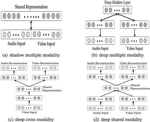 在多模态学习场景中,音频频谱图和视频帧以线性方式连接成向量。将串联向量馈入稀疏受限玻尔兹曼机 (SRBM),以学习音频和视频之间的相关性。该模型只能学习多个模态的阴影联合表示,因为相关性隐含在原始级别的高维表示中,而单层 SRBM 无法对它们进行建模。受此启发,中级表示的串联向量被输入到 SRBM 中,以模拟多个模态的相关性,从而显示出更好的性能。