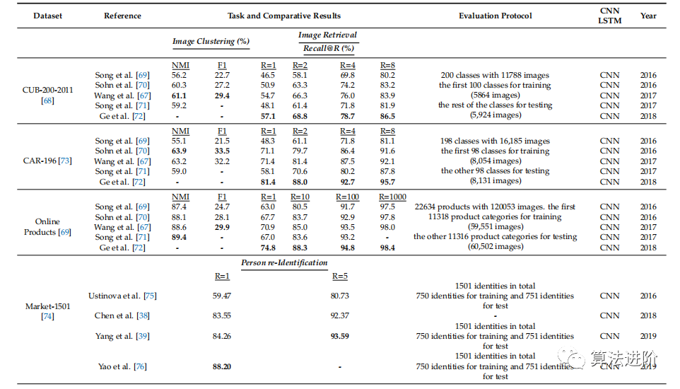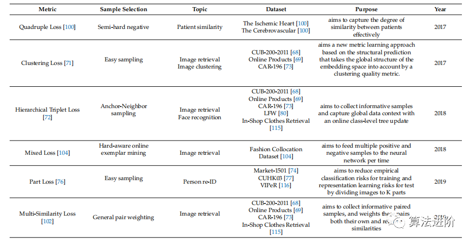 在训练阶段之前,必须为Siamese、Triplet和n-double网络准备训练数据,此过程需要更多磁盘空间并且非常耗时。宋等人提出了一种新的深度度量学习方法,使用聚类损失将样本聚集在一个聚类中(图 6g),防止不同的簇相互接近。里佩尔等人强调三元组损失一次评估一个三元组样本来训练数据集,减少网络的学习时间。然而,这种方法会导致性能不佳和培训不足。因此,他们建议磁体损失,这会惩罚簇重叠并评估簇中最近的邻居以分离多个簇。所提出的方法具有局部区分度,并且与优化过程全局一致。混合损失受到三元组损失的启发,除了anchor和负样本之外,还使用三个正样本和三个负样本来建立样本之间的相似关系。图6h说明了在使用局部邻域时相似样本如何接近最近的集群。表2详细总结了文献中最先进的损失指标。