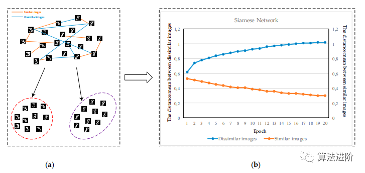图2 连体网络的距离关系。(a) 期望的三位数和八位数手写数据辨别,(b) Siamese网络应用于三位数和八位数的MNIST数据后