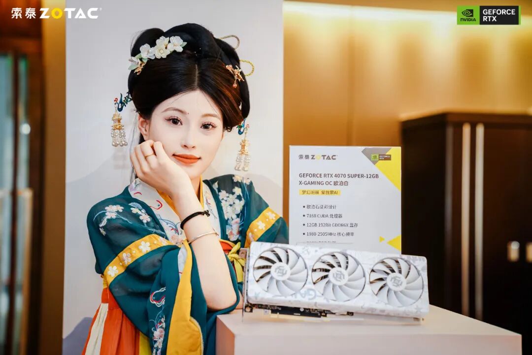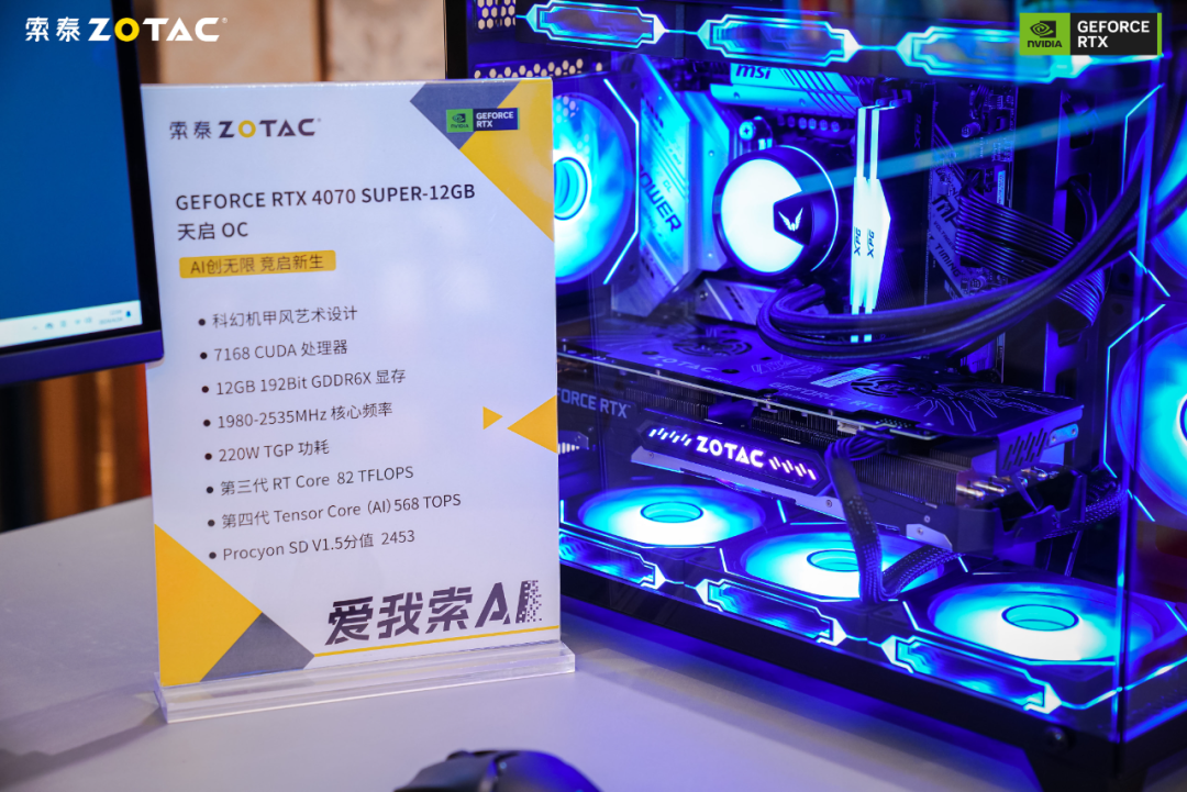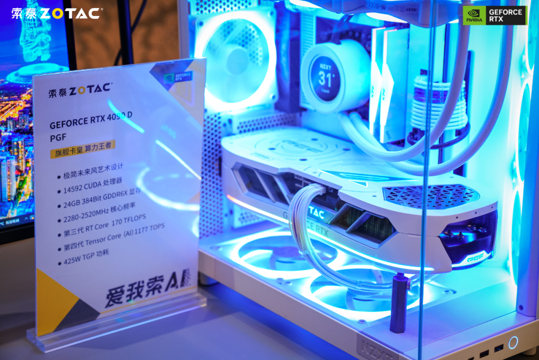 在峰会现场,索泰也展示了不少在AI创作、AI算力上有强大优势的显卡和主机。充满科技感的设计,搭配强劲的性能,正是AI时代所需要的的硬件装备。