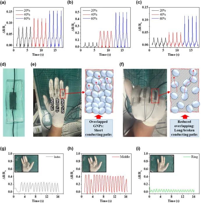 图4。压敏电阻特性。水凝胶压敏电阻在不同应变(20%、40%、60%)下的传感器响应(ΔR/R0):(a) 0%GNP, (b) 15%GNP, (c) 20% GNP。(d)单个组装水凝胶传感器的照片。弯曲前(e)和弯曲后(f)的三只手指上附有三个压阻式传感器的手的照片(食指-0% gnp,中指-15% gnp和无名指-20% GNP)及其相应的导电网络。不同手指弯曲运动的照片及其相应的输出信号:(g)食指,(h)中指,(i)无名指。