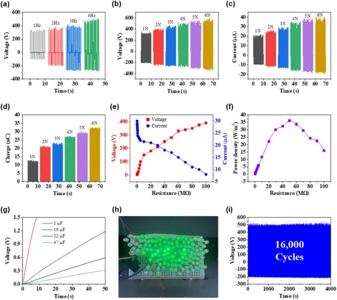图3。优化后的7次回收水凝胶的G-TENG输出性能。(a)随频率变化的G-TENG开路电压与G -水凝胶回收率优化(20%GNP)。(b-d)通过改变施加的压缩力,G-TENG的开路电压、短路电流和转移电荷量随着g -水凝胶回收率(20%GNP)的优化而变化。(e)电压、电流和(f) 7号回收水凝胶的TENG功率密度随外部负载电阻的变化关系,范围从0.1 MΩ到100 MΩ。(g)在4N, 4Hz的外力作用下,优化后的7号回收水凝胶不同电容器的充电曲线。(h) G-TENG为126个led供电。(i)优化后的7号回收水凝胶的耐久试验,循环次数超过16000次。