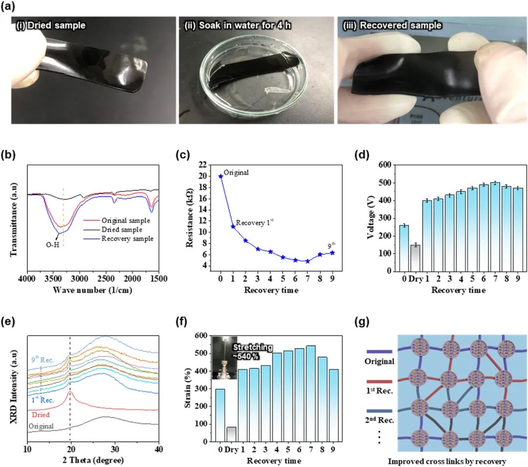 图2。通过恢复过程改进交联。(a)复原过程摄影。(b)原始、干燥和回收的FTIR光谱。(c)不同回收周期下G -水凝胶的阻力。(d)恢复过程不同周期下的输出电压。(e)原始、干燥和不同循环回收水凝胶的XRD。(f)原始、干燥和恢复样品的抗拉强度差异。(g)回收水凝胶的均匀和紧凑网络示意图,突出不同的交联密度和晶体域。