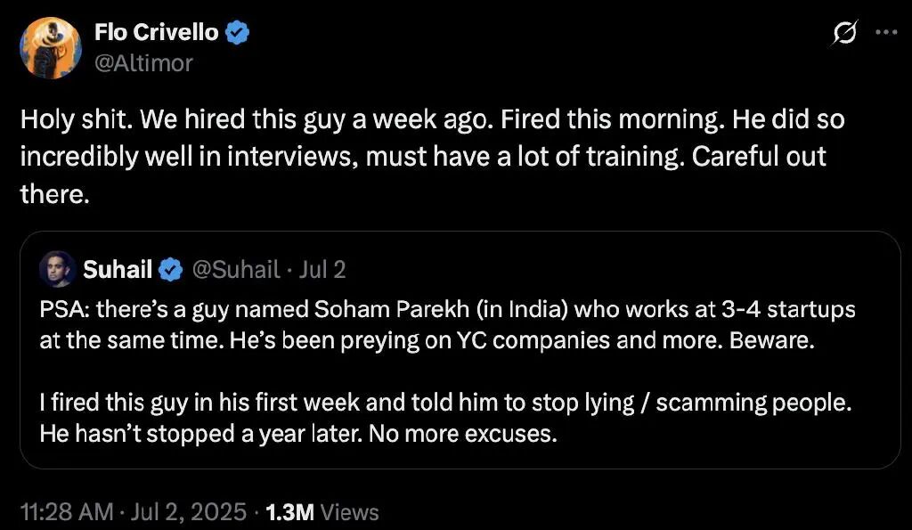 AI工作流程自动化初创公司Lindy的CEO Flo Crivello表示,他们刚刚聘用了Parekh,但在发现其履历和工作状态存在异常后,仅用了一周时间就将他解雇。“他面试表现极其出色,显然是经过精心包装的。”