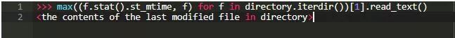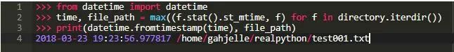 .iterdir(),.glob()和.rglob()方法非常适合生成器表达式和列表解析。 要在上次修改的目录中查找文件,可以使用.stat()方法获取有关底层文件的信息。 例如,.stat().st_mtime给出了文件上次修改的时间: