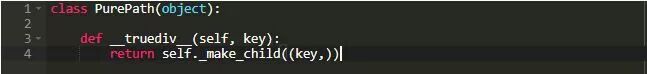 可能是pathlib库最不寻常的部分是使用/运算符。 窥探一下源码,让我们看看它是如何实现的。 这是运算符重载的一个例子:运算符的行为根据上下文而改变。 你以前见过这个。 想想+对于字符串和数字来说意味着不同的东西。 Python通过使用双下划线方法(a.k.a. dunder方法)来实现运算符重载。