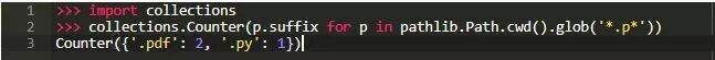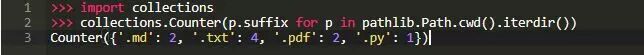 列出大量文件有几种不同的方法。 最简单的是.iterdir()方法,它遍历给定目录中的所有文件。 以下示例将.iterdir()与collections.Counter类组合起来,以统计当前目录中每个文件类型的文件数量: