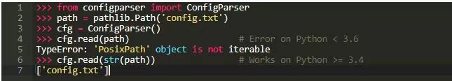如果您正在使用不知道如何处理pathlib.Path对象的库,这特别有用。 这是3.6之前的Python版本中的一个大问题。 例如,在Python 3.5中,configparser标准库只能使用字符串路径来读取文件。 处理这种情况的方法是明确地转换为字符串: