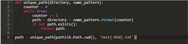 最后一个例子将显示如何基于模板构建唯一编号的文件名。 首先,为文件名指定一个模式,并为计数器留出空间。 然后,检查通过加入目录和文件名创建的文件路径是否存在(使用计数器的值)。 如果它已经存在,请增加计数器并重试: