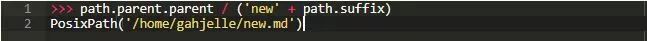 请注意.parent返回一个新的Path对象,而其他属性返回字符串。 这意味着,例如,可以像上一个示例那样链接.parent,甚至可以与/组合创建完全新的路径: