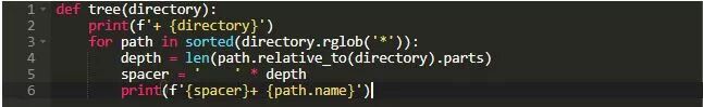 请注意,我们需要知道文件所在的目录到根目录有多远。 为此,我们首先使用.relative_to()来表示相对于根目录的路径。 然后,我们计算表示中的目录数量(使用.parts属性)。 运行时,此函数创建如下的可视化树: