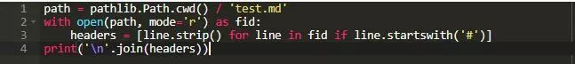 习惯上,使用Python读取或写入文件的方法是使用内置的open()函数。 这仍然是正确的,因为open()函数可以直接使用Path对象。 以下示例查找Markdown文件中的所有标题并打印它们: