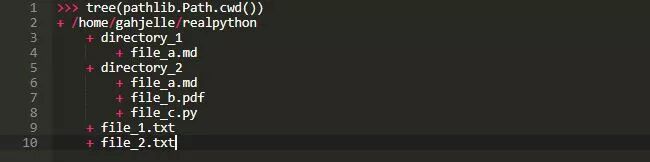 下一个示例定义了一个函数tree(),它将打印一个表示文件层次结构的可视化树,该树以根目录为根。 在这里,我们也想列出子目录,所以我们使用.rglob()方法: