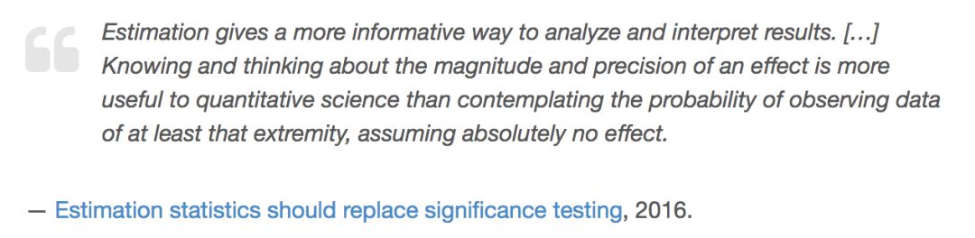 估计提供了一种信息量更大的方式来分析和解释结果。[…]了解和思考一个影响的大小和精度对于定量科学而言更有用,而不是先假设完全没有影响,再考虑观察到极值数据的概率。