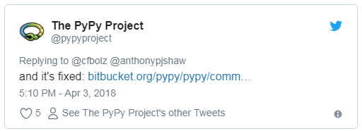 PyPy 也同样需要面对从 Python2 向 Python3 转变的问题。PyPy3 还不太稳定,PyTest 就已经放弃了对 PyPy3 的支持。