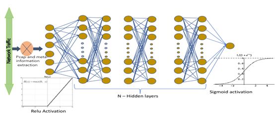 请注意,源IP/端口、目标IP/端口和协议字段已经从实例中删除,因为它们会导致模型过拟合。我们使用具有N隐藏层的深度前馈神经网络来处理其他所有特征。神经网络的架构如图5所示。