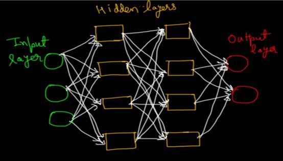 可以使用神经元层来构建神经网络。网络需要实现的目标不同,其架构也是不同的。常见的网络架构是前馈神经网络(Feed ForWard Neural Network,FFN)。神经元在无环的情况下线性排列,形成FFN。因为信息在网络内部向前传播,它被称为前馈。信息首先经过输入神经元层,然后经过隐藏神经元层和输出神经元层(图2)。