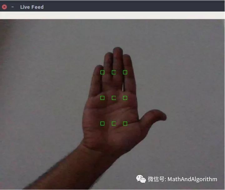在框架中绘制一个绿色的长方形并且用户将他们的手放置在长方形中。应用程序提取用户手掌的肤色,然后绘制成一个直方图。