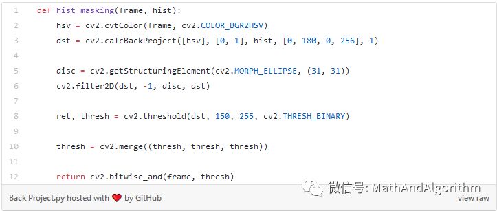 现在基于肤色直方图我们可以找到包含皮肤的框架区域,OpenCV 提供了一个简便的方法,cv2.calvBackProject,该方法使用直方图来分离图像中的特征。我通过这个函数来把肤色直方图应用到框架中。如果你想获取更多关于 back project 的信息,可以通过链接1(https://docs.opencv.org/master/dc/df6/tutorial_py_histogram_backprojection.html)和链接2(https://docs.opencv.org/2.4/doc/tutorials/imgproc/histograms/back_projection/back_projection.html)来获取。