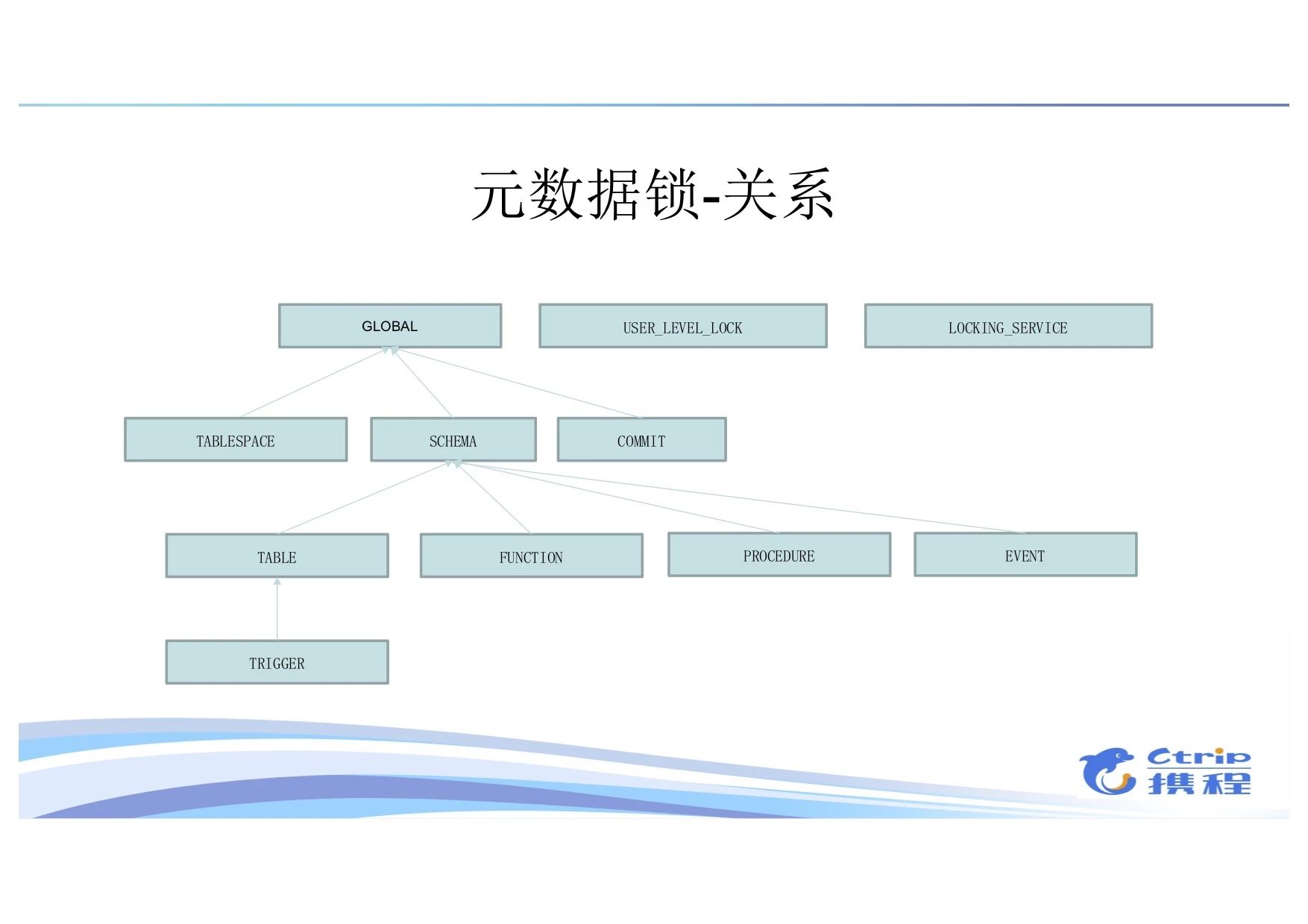 类型有这么多数据锁,这张图可以看到数据锁之间的看到。global锁下面,它所谓的关系是什么?这里面关系是在大部分情况下,如果我要对这里面某一个元数据上锁的时候,它有一些前置锁。
