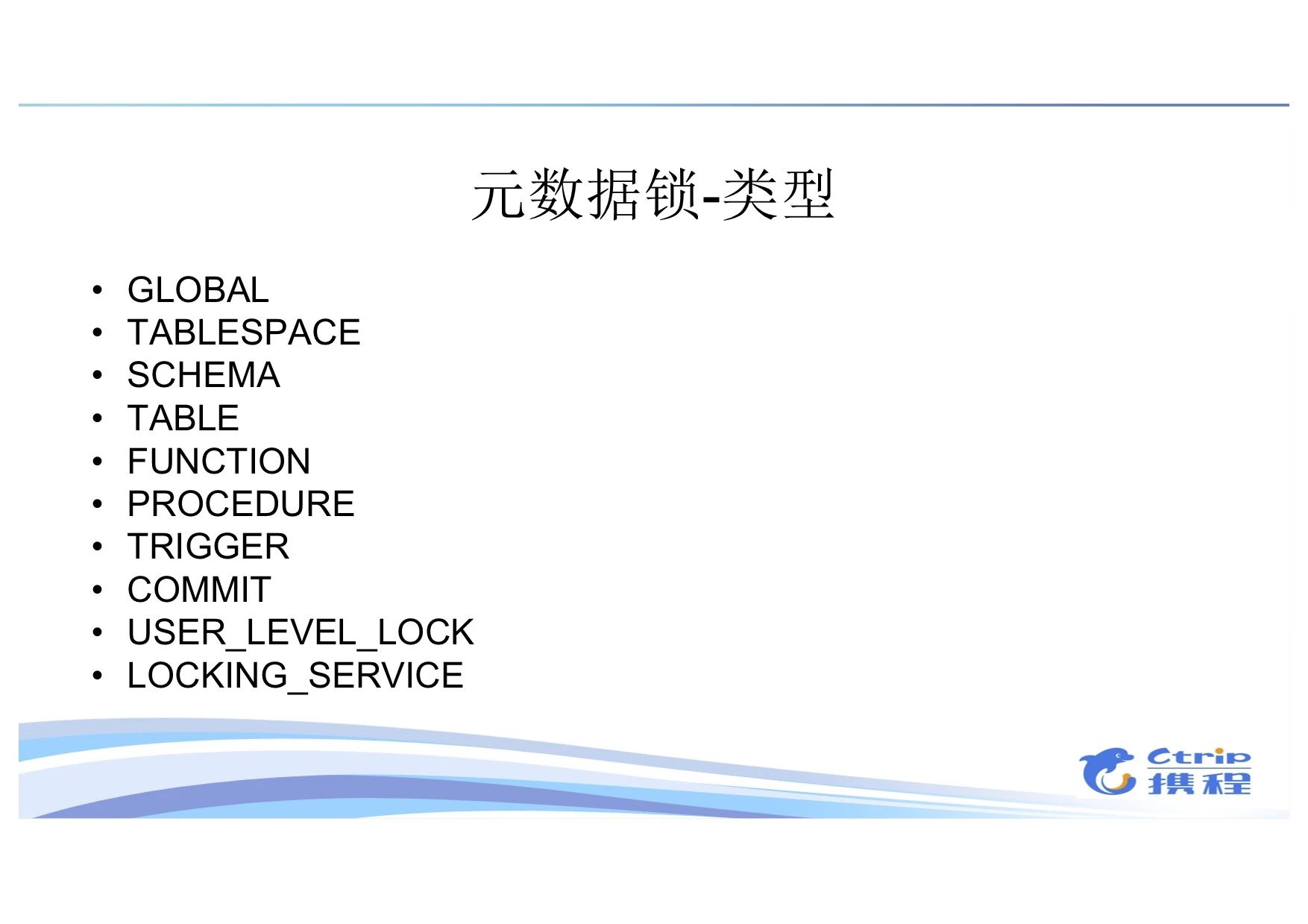 还有一个schema,schema是MySQL里面有一个概念上的混淆,这里面元数据锁对应schema的对象,还有我们下面FUNCTION锁、PROCEDURE锁、TRIGGER锁,这三个锁,commit锁,我在commit提交的时候,它需要持有让COMMIT串行化方式的锁,并不常见到,但是每次commit一定都会有,它和global差不多的。