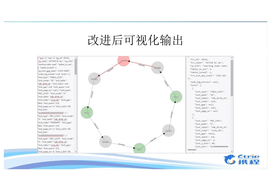 这里面,之前我们看图像里面打印一个锁信息,我们操作的时候把一个事务里面所有上锁信息全部打印出来了,可视化的操作时候就是把之前输出的信息全部拿出来之后,可以看到这样一个结果,这个对我们线上运维还是挺有帮助。不过有一个问题是什么,你判断不出来,这里面打印信息还是不够全,不能把所有锁涉及到的操作,就是产生所的语句打印出来,我们改进时候有一个配套工程,做一个MySQL的全量trx输出,实际上运维可以根据线上这些信息把当时开发所做的事情拿出来,定位开发的一些问题。