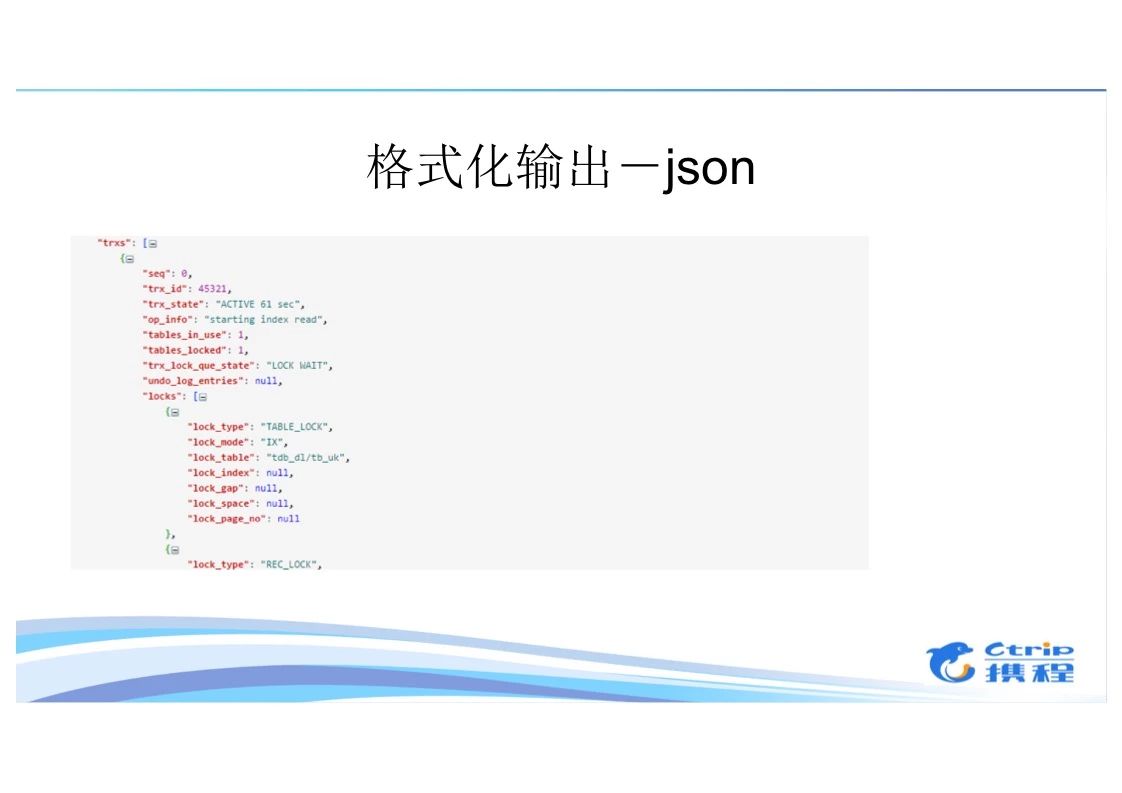打印这个信息,这个信息不够格式化,产生的内容不好读。第二点,不能把所有参与到死锁里面的事务全部打印出来,我们针对这种情况,实际上我们做了改造,我们希望能把这些信息都格式化出,而且可视化展示。我们做了格式化输出,把它都输出成这个格式,后面是一个数组,哪些事务全部打印出来。