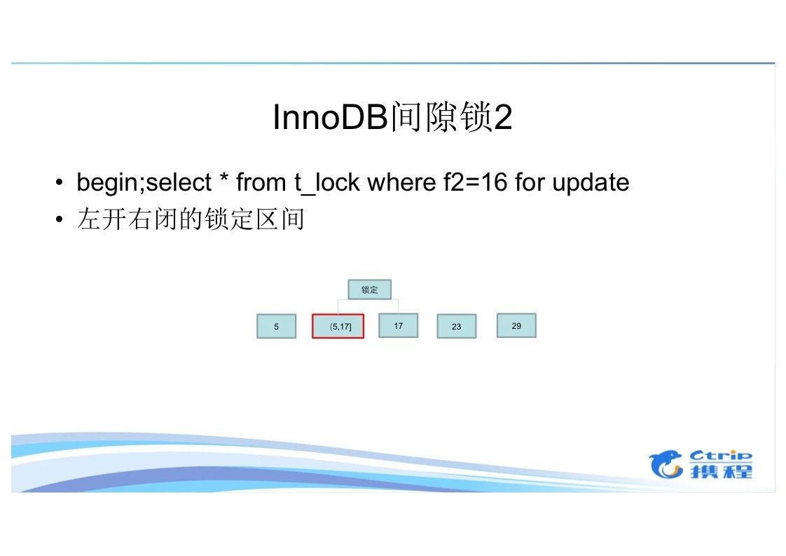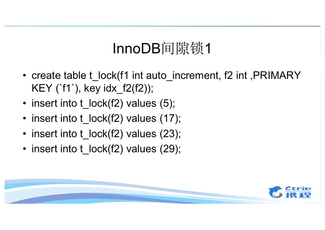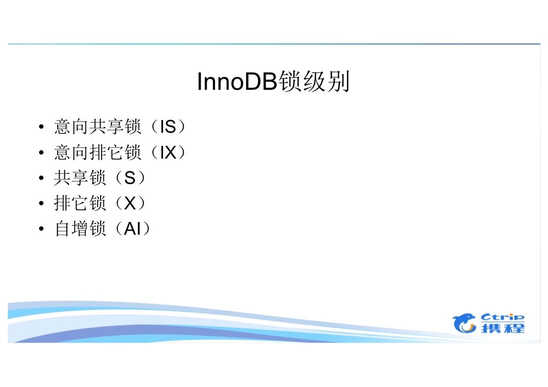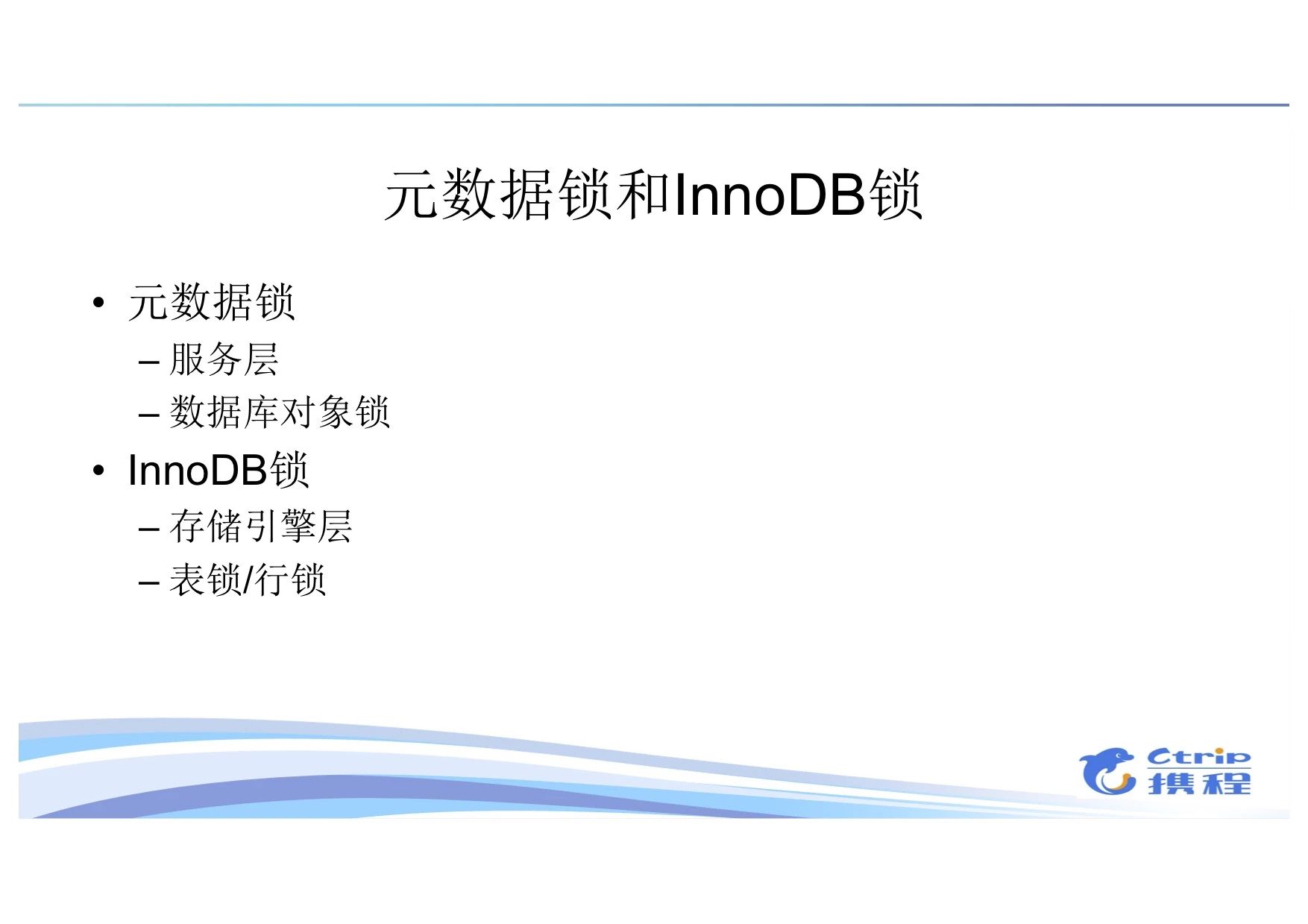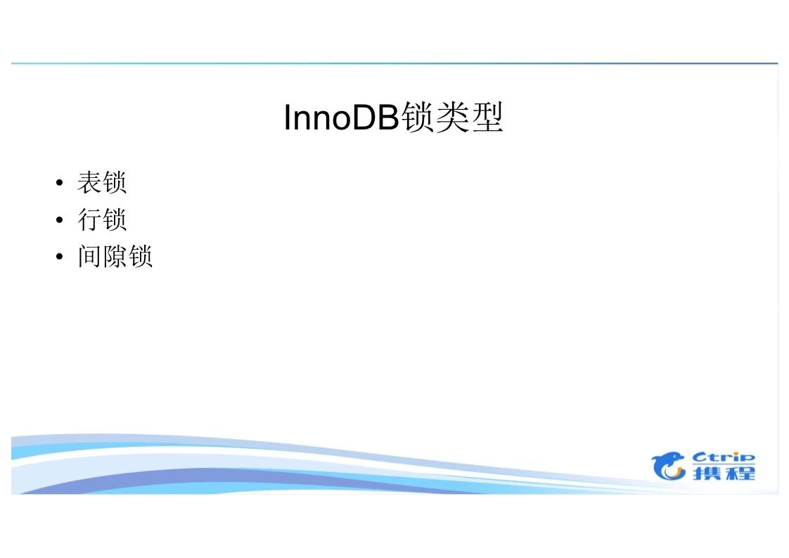 下面讲InnoDB锁,我分这几个部分介绍一下,实际上InnoDB锁是一个非常复杂,PPT里面只能介绍一部分,介绍的这部分也只是针对这种情况下的一个间隙锁的实现,前面还会介绍一些前置知识,事务隔离级,在讲InnoDB会讲锁的级别,间隙锁怎么样,还有和上面MDL告诉源码主要哪几个地方,什么重要入口在哪里。还有再讲一下我在携程针对这方面做了哪些源码改造。