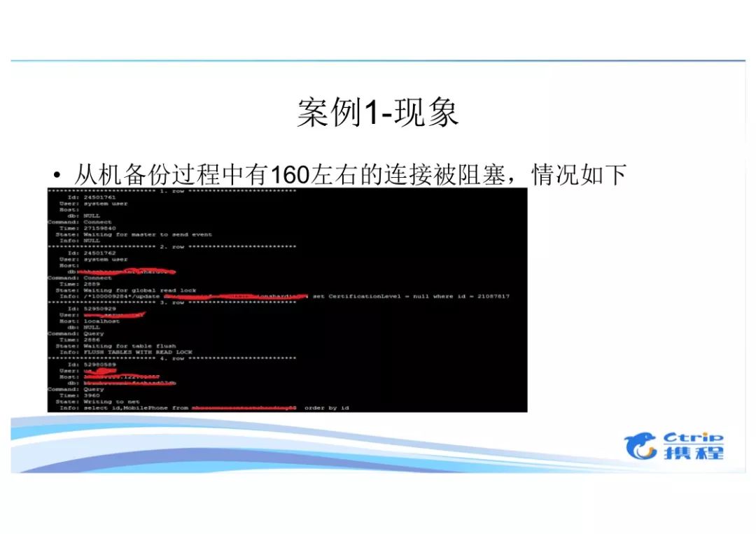 这是我们线上碰到现象,重新做备份160个左右连接被阻塞,情况就是这个图。这里面有一个time时间,处理这个问题的时候直接到time时间最长连接,整个问题就都解决了,我们问题解决了还要找它的根本原因,了解到这个原因之后,以后可以避免类似情况再发生。