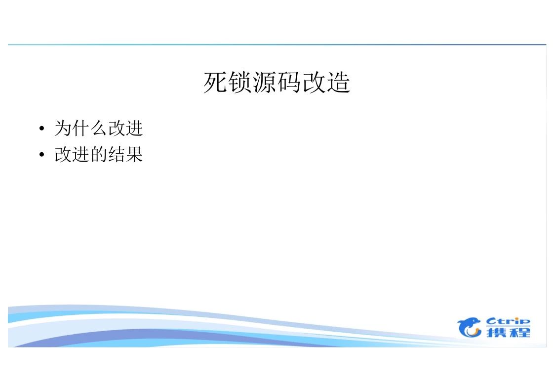 我再讲一下携程做了相关的事务锁的改造,这个是我们最 常见碰到的现象,发生死锁一定出这个东西,下面的红框产生死锁,这个操作产生死锁的事务,上面是它前面的一个事务,假设我们有一个环,这个操作造成死锁,一直到后面产生闭环,这是一个死锁。