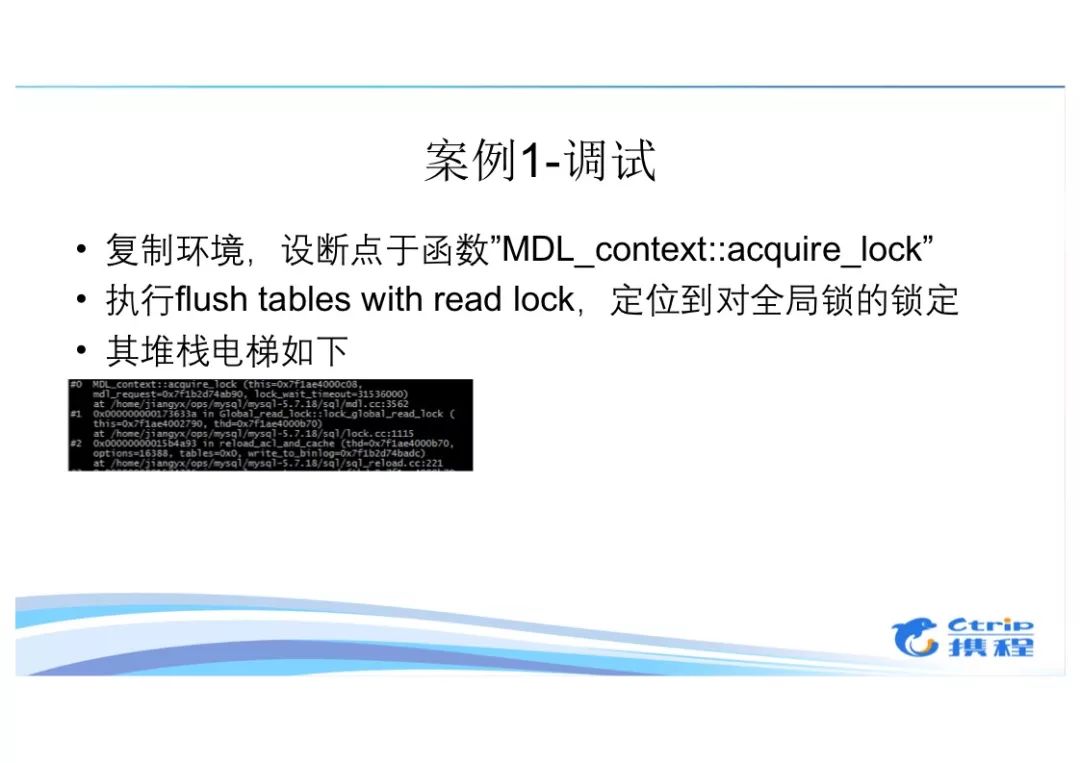 我们在这块设置断点,我们执行flush tables with read lock得到一个堆栈电梯,在调试的时候我们强调堆栈电梯,而且以后你们碰到问题向别人求助的时候,最好也能抓住这样堆栈电梯。