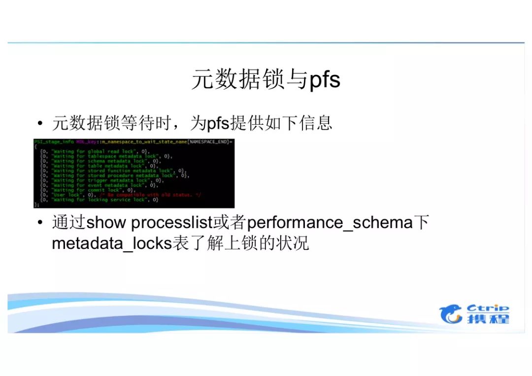 这个就是讲元数据锁与PFS,元数据在上锁时候,我在进行等待,我等待了一个什么样的锁,就是这个东西。当我们在show processlist或者performance_schema下面,然后metadata_locks表查的时候,我们读到就是这些信息,实际这些信息和我们这个锁是一一对应的。