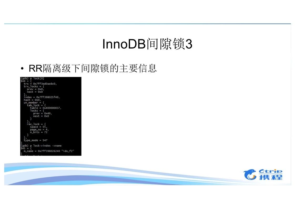 我们再讲一下间隙锁,看一下间隙锁在内存里面打印的结果,MySQL锁结构非常简单,就是整个lock打印出来就是这么多,锁处于哪一个事务,这个锁在哪一个index上,这是C里面特殊语法结构,告诉你上一个锁是table锁还是lock锁。这个是加特殊标识,分成16进制是512,这是间隙锁内存里面,打印出来间隙锁的样例。