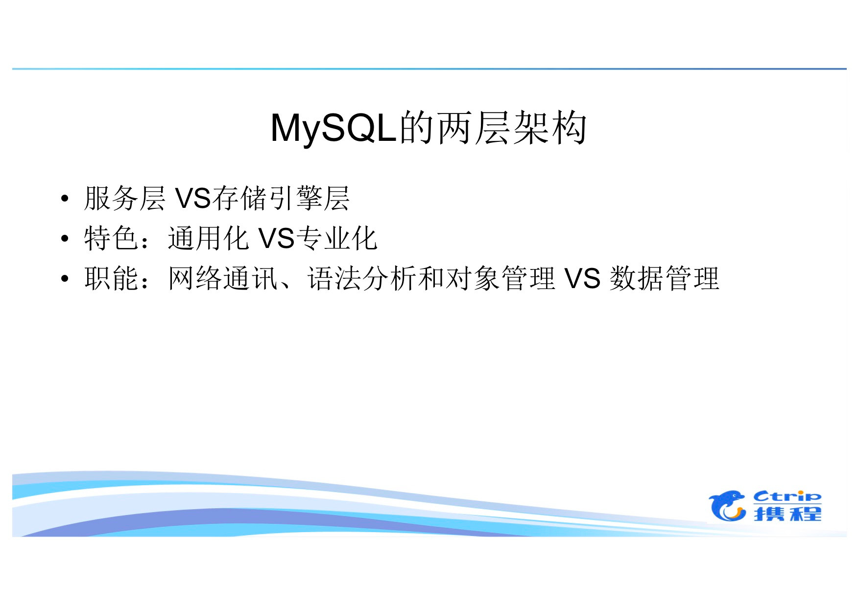 首先我先介绍一下MySQL两层架构,MySQL的两层架构所有数据库里面,除了MySQL以外,其他数据库都没有这个特点,MySQL两层架构就是它把服务层和存储引擎层拆成两个层次来看待,服务层集中所有通用化的功能,如网络通讯和语法分析等工作。