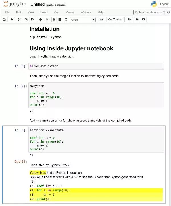 (http://cython.readthedocs.io/en/latest/src/reference/compilation.html#compiling-with-a-jupyter-notebook)%%cython 就可以像写 Python 代码一样写 Cython 代码了。