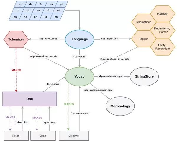 StringStore 可以从 spaCy 中的任何地方、任何对象中访问,例如可以通过 nlp.vocab.string、doc.vocab.strings 或 span.doc.vocab.string 等。
