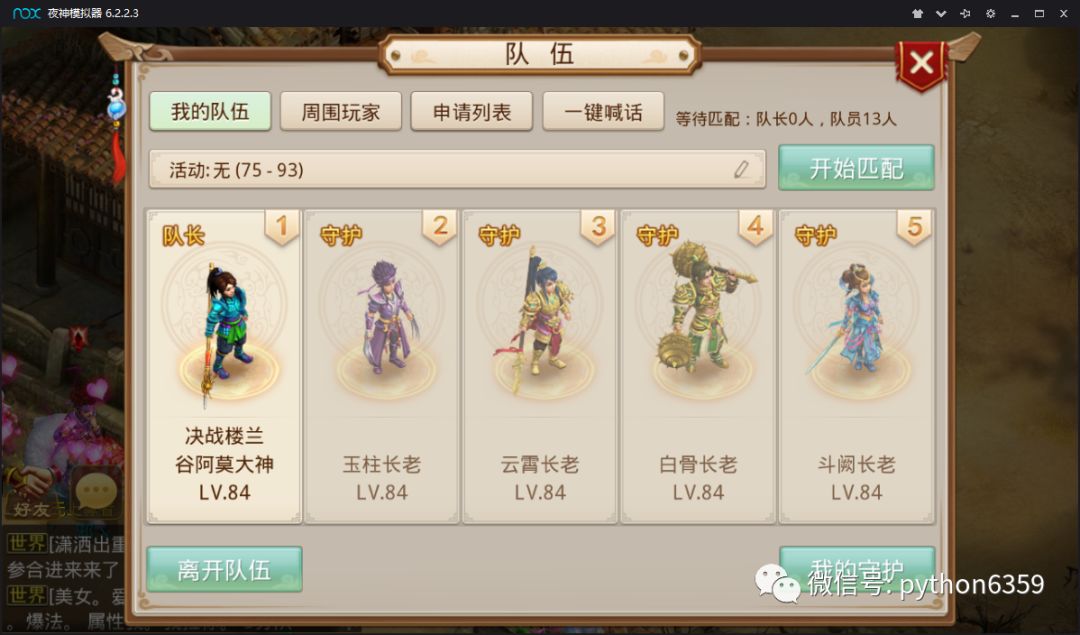 我的思路是,隔一段时间对夜神模拟器截图,再对这张截图文字识别,判断“斗阙长老”和“白骨长老”是否存在于识别出的字符串中。当然,也可以判断长老数量是否小于等于2