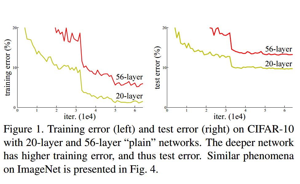 由上图我们可以看到 56 层的普通卷积网络不管是在训练集还是测试集上的训练误差都要高于 20 层的卷积网络。是个典型的退化现象。退化问题不解决,咱们的深度学习就无法 go deeper. 于是何恺明等一干大佬就提出了残差网络 ResNet (Deep Residual Learning for Image Recognition,2015)。