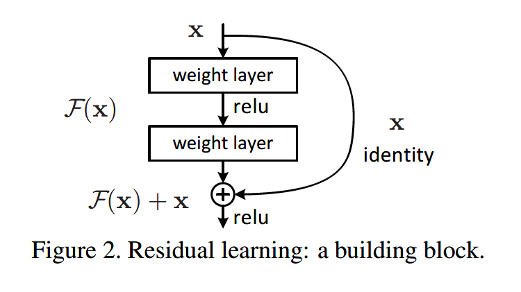何恺明给出的创新在于给网络之间添加一个捷径(shortcuts)或者也叫跳跃连接(skip connection),可以让捷径之间的网络能够学习一个恒等函数,使得在加深网络的情形下训练效果至少不会变差。残差块的基本结构如下: