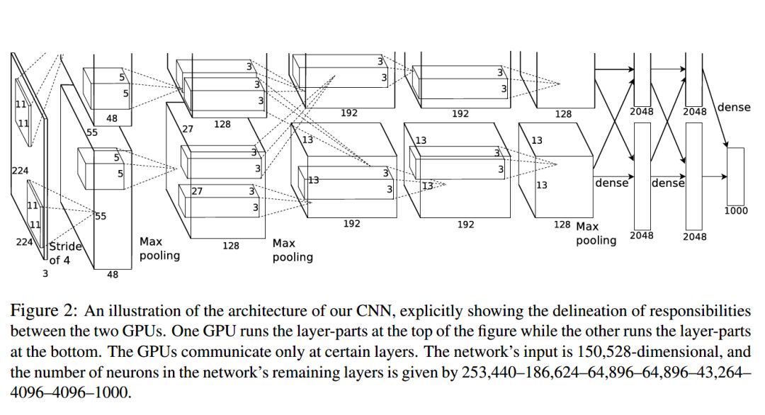 AlexNet 继承了 LeCun 的 Le-Net5 思想,将卷积神经网络的发展到很宽很深的网络当中,相较于 Le-Net5 的六万个参数,AlexNet 包含了 6 亿三千万条连接,6000 万个参数和 65 万个神经元,其网络结构包括 5 层卷积,其中第一、第二和第五层卷积后面连接了最大池化层,然后是 3 个全连接层。AlexNet 的网络架构如图所示: