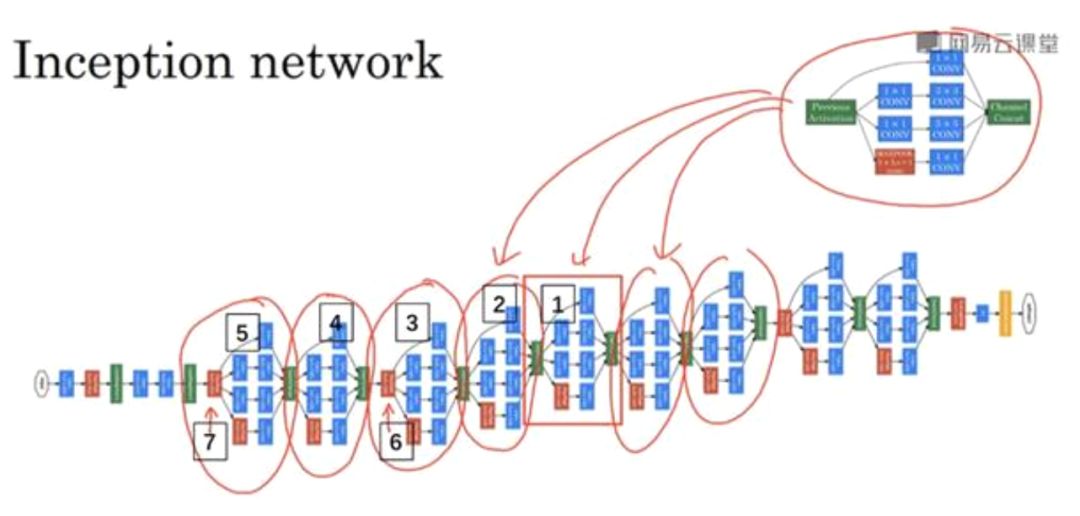 构建好 Inception 模块后,将多个类似结构的Inception模块组合起来便是一个Inception 网络,如下图所示: