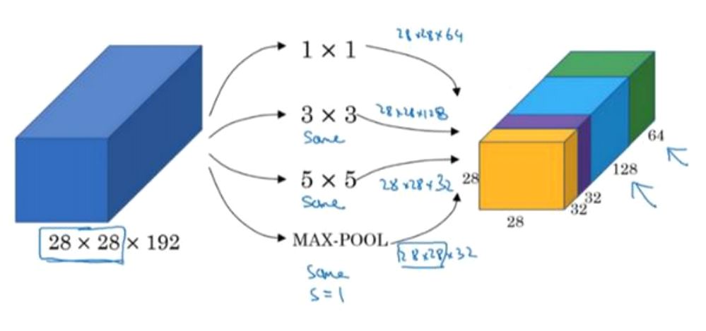 对于 28x28x192 的像素输入,我们分别采用 1x1 卷积、3x3 卷积和 5x5 卷积以及最大池化四个滤波器对输入进行操作,将对应的输出进行堆积,即 32+32+128+64=256,最后的输出大小为 28x28x256。所以总的而言,Inception 网络的基本思想就是不需要人为的去决定使用哪个卷积结构或者池化,而是由网络自己决定这些参数,决定有哪些滤波器组合。